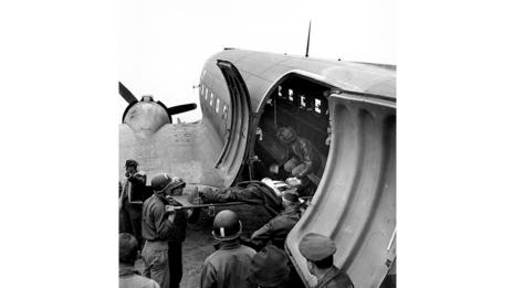“The ward was like a jungle of banyan trees. A maze of hanging rubber tubes swaying in khaki shadow – one to the nostril and one to the wound of each man.” Miller’s description of an evacuation hospital near Omaha beach in Normandy was published in the fashion magazine in August 1944. Her story, Unarmed Warriors, was Miller’s first as a war correspondent accredited by the US Forces.