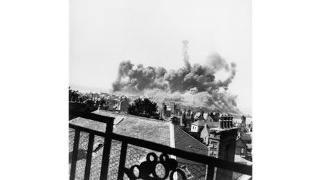 Miller spent time on the frontline too: after reports that St Malo had been liberated in August 1944, she was sent on a seemingly safe assignment to report from the French town. But when she arrived, she discovered it was still held by German forces. From a hotel room, Miller documented the gunfire in her own inimitable style: “The rooms had innerspring mattresses which made a rather bouncy perch for picture-taking, especially as the artillery bursts made me jump a bit each time.” She describes two soldiers lying on a bed “in a beautiful honeymoon room facing the sea”, with a telescope trained on their target.