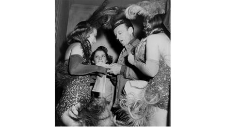 A world away from the battlefront, in Paris Miller photographed Marlene Dietrich in a satin coat by Schiaparelli and Fred Astaire signing autographs for the “bare-bottomed girls of the cast in feathers”. Yet she never settled back into her pre-war life. In a 1945 letter to Scherman, she describes her restlessness: “for some reason I always want to be somewhere else”.